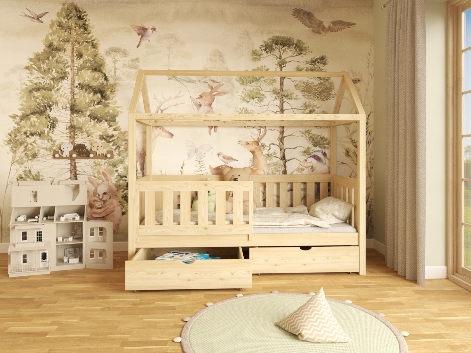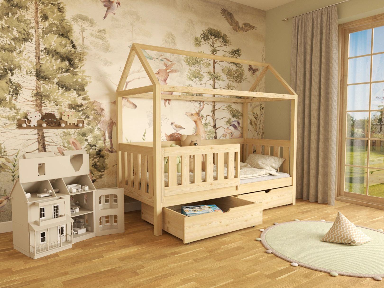 Łóżko typu domek Mieszko I to hit wśród maluchów, przenoszący światdziecięcych zabaw do ich ulubionego łóżeczka. Ten modny mebel nie tylko zapewniakomfort, ale także stanowi doskonały element dekoracyjny w pokoju dziecięcym.Wykonany z litego drewna sosnowego, gwarantuje wytrzymałość i efektowny wygląd.Z myślą o bezpieczeństwie dodano bariery ze szczebelkami, chroniące przed upadkiem.Górna część łóżka imituje konstrukcję domku, pozwalając na dodawanie dekoracji,np. kolorowych światełek cotton balls.