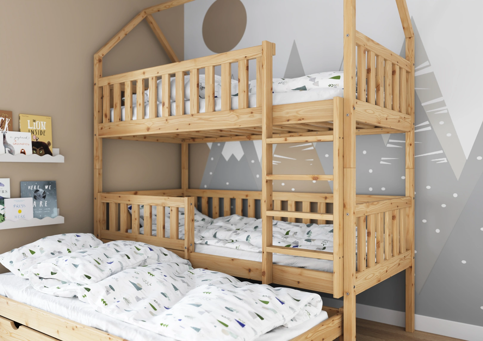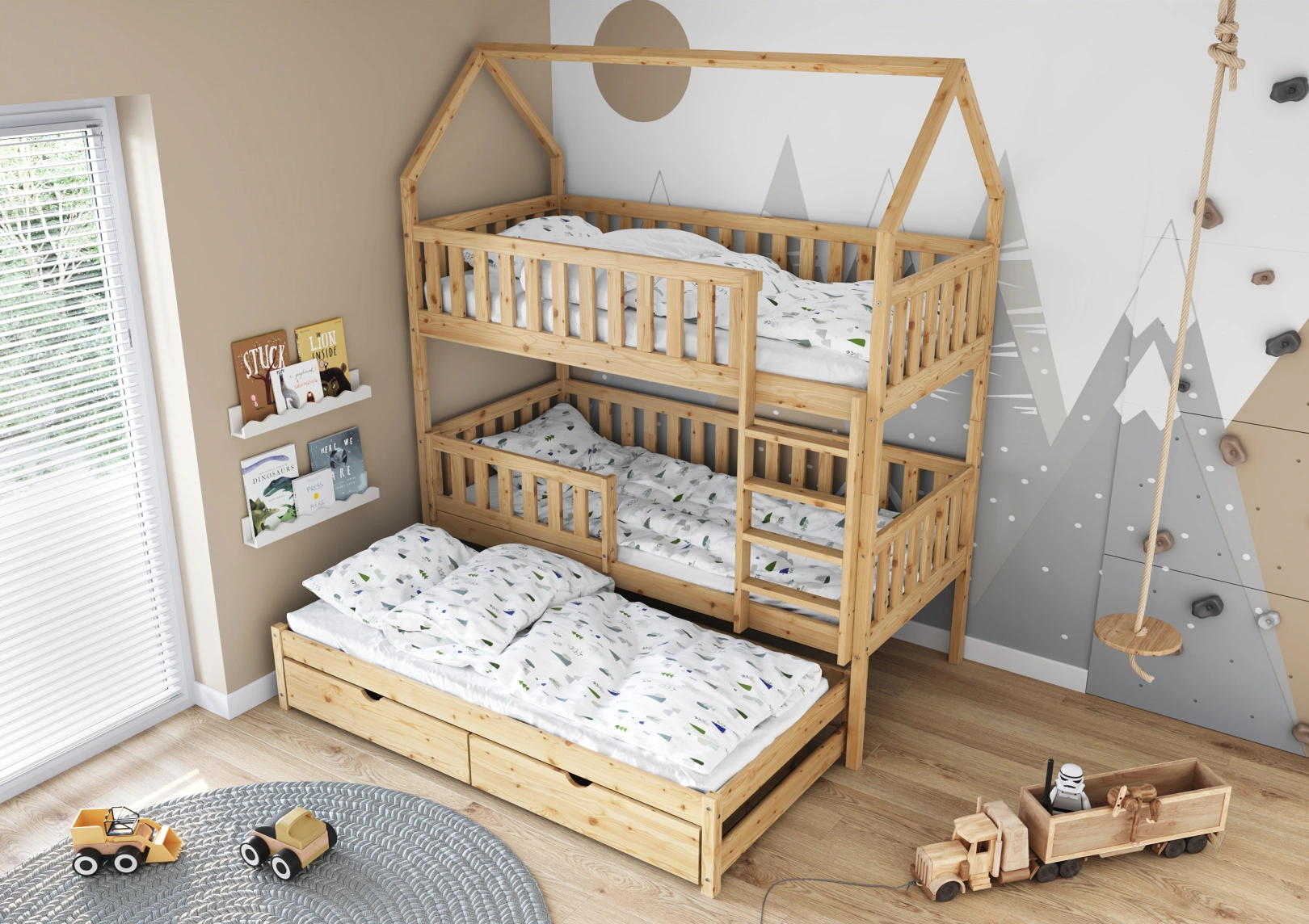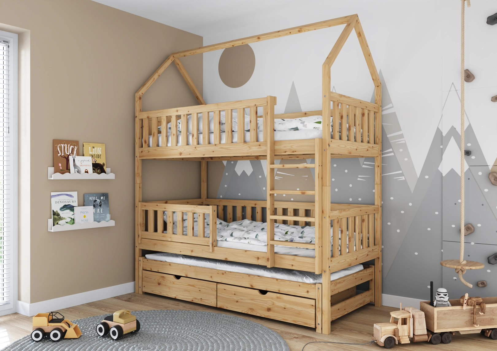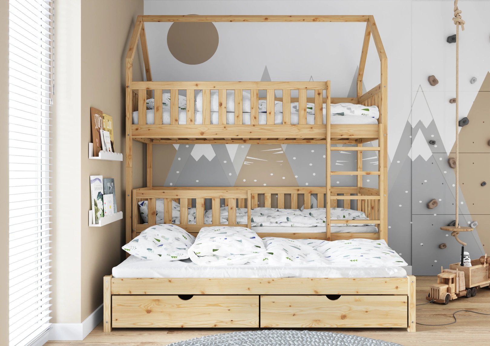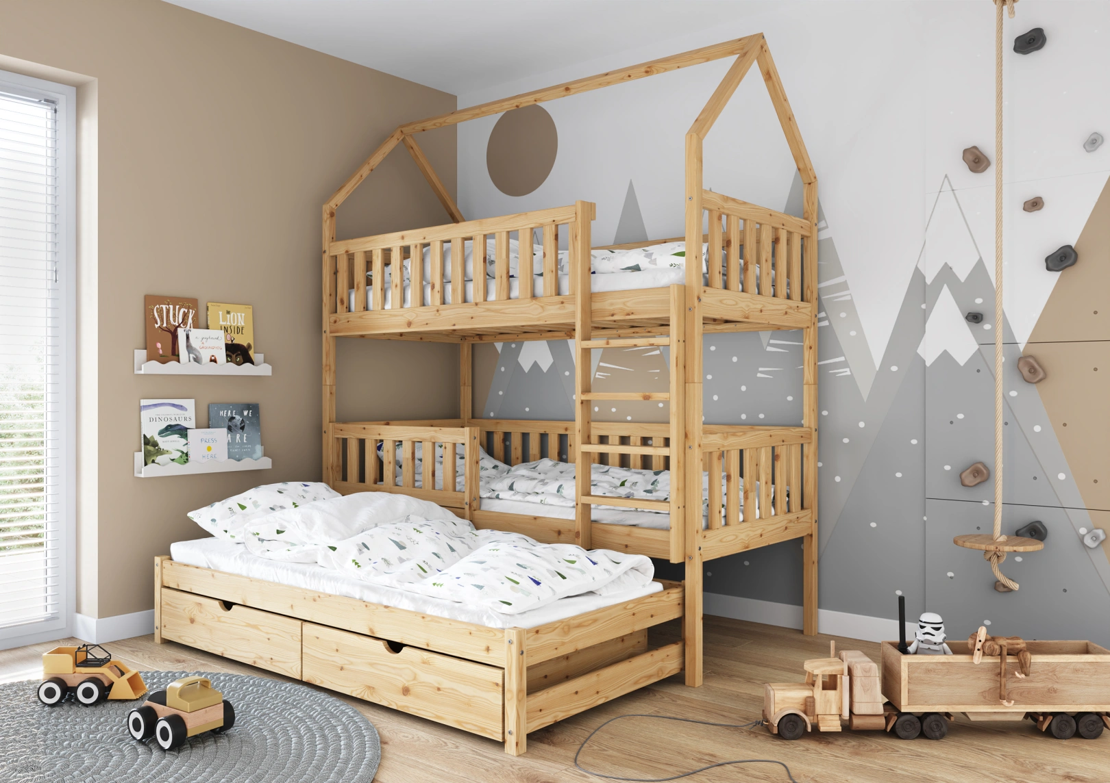 Wyposażone w bariery zabezpieczające, łóżko Mieszko III zapewnia bezpieczny sen dla dzieci. W ciągu dnia staje się natomiast doskonałym miejscem do kreatywnych zabaw na każdym z dostępnych pięter.
