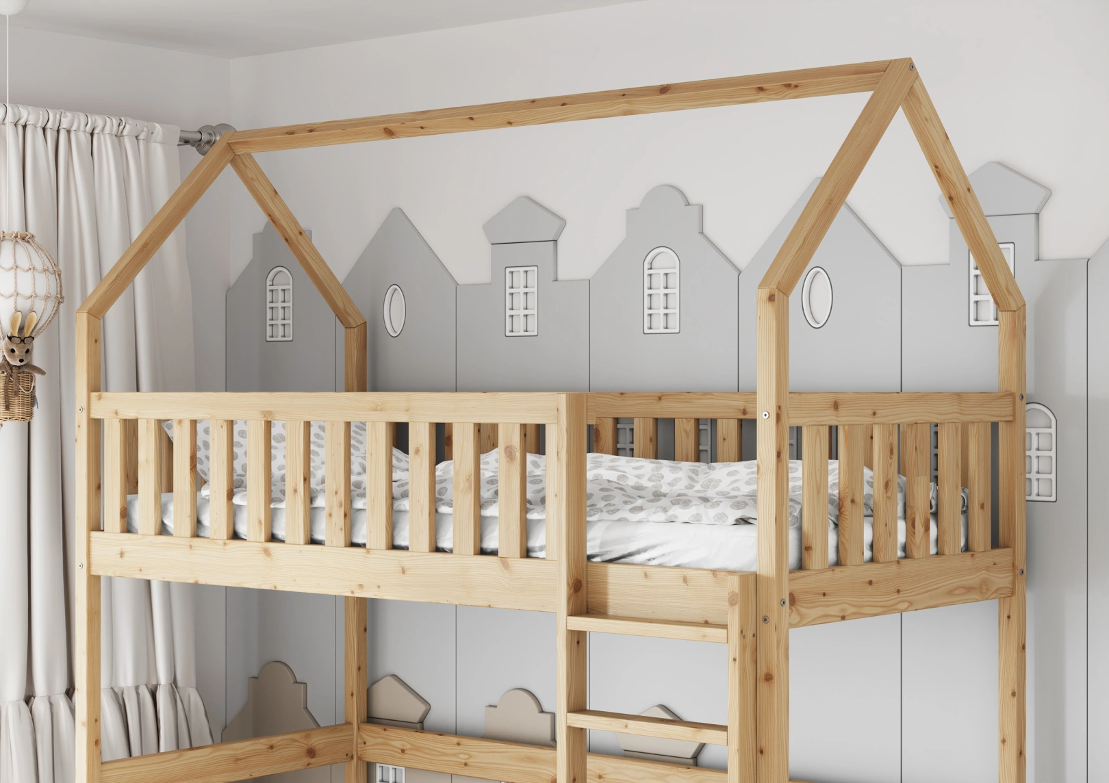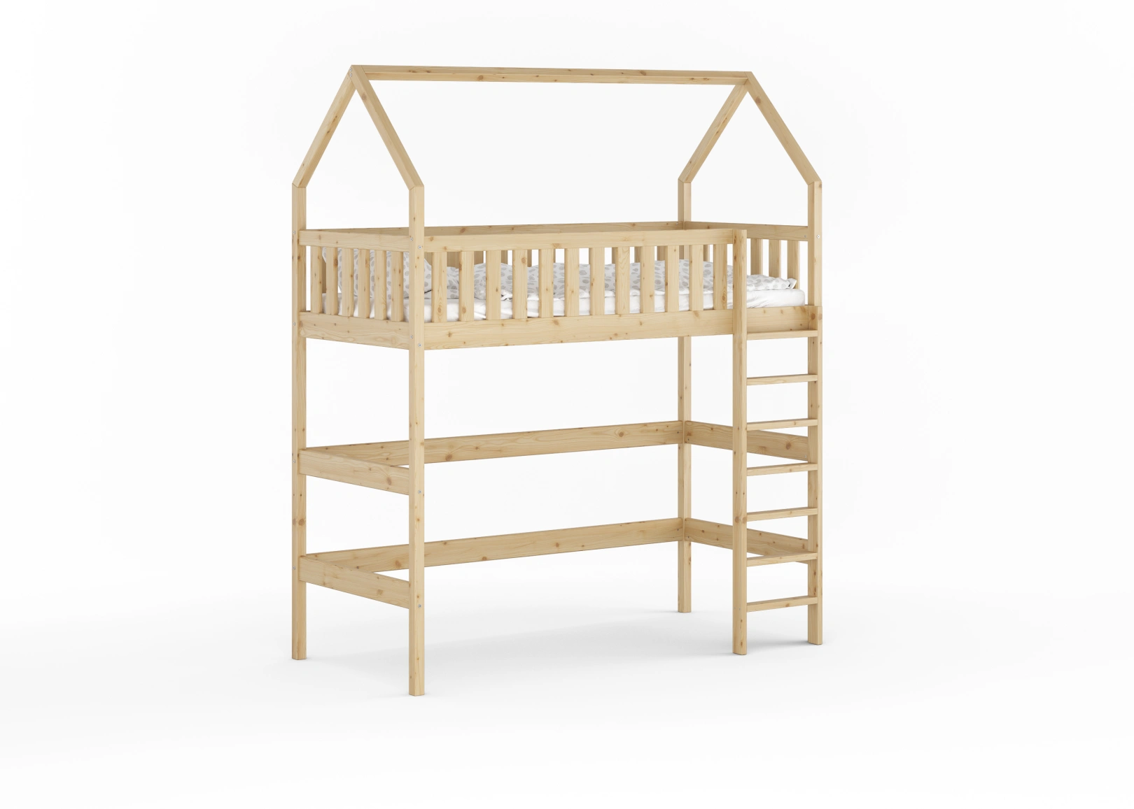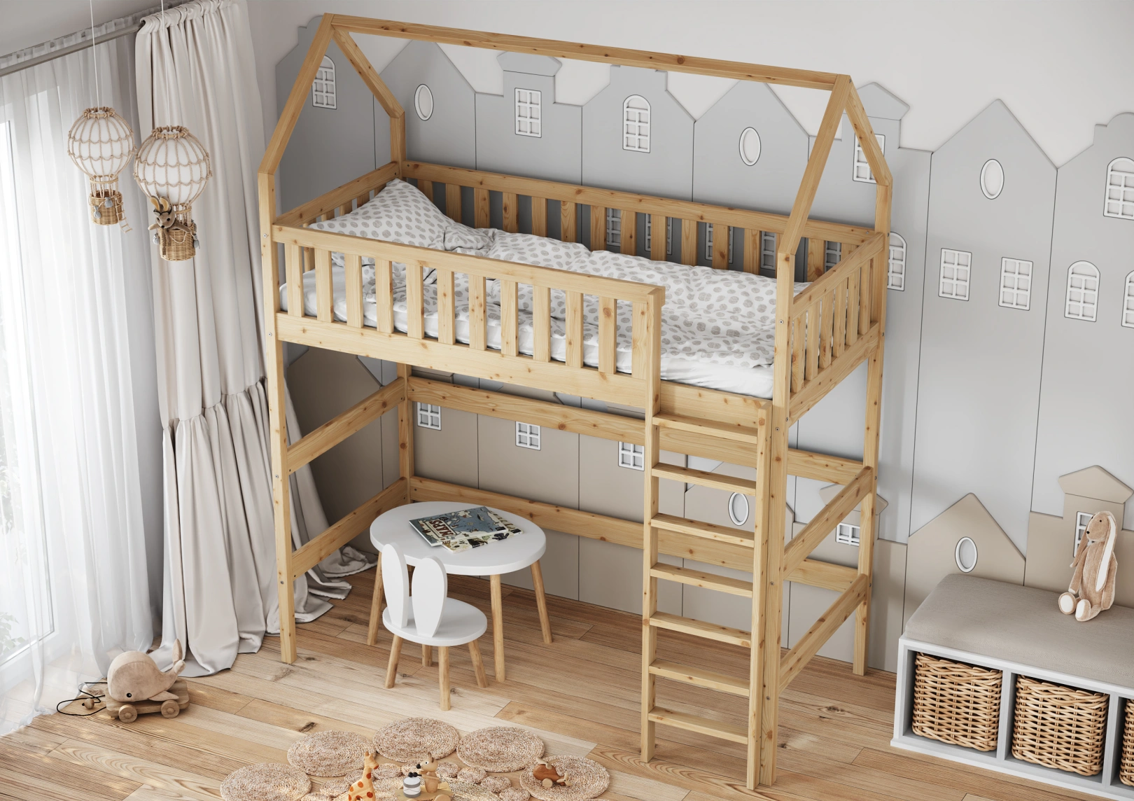 Solidna drabinka do łóżka z drewna sosnowego z szerokimi stopniami i poręczami zapewnia bezpieczny dostęp do górnej części. Idealna dla trzylatków, gwarantuje stabilność łóżka. Estetyczny dodatek, który jednocześnie ułatwia życie i ozdabia pokój