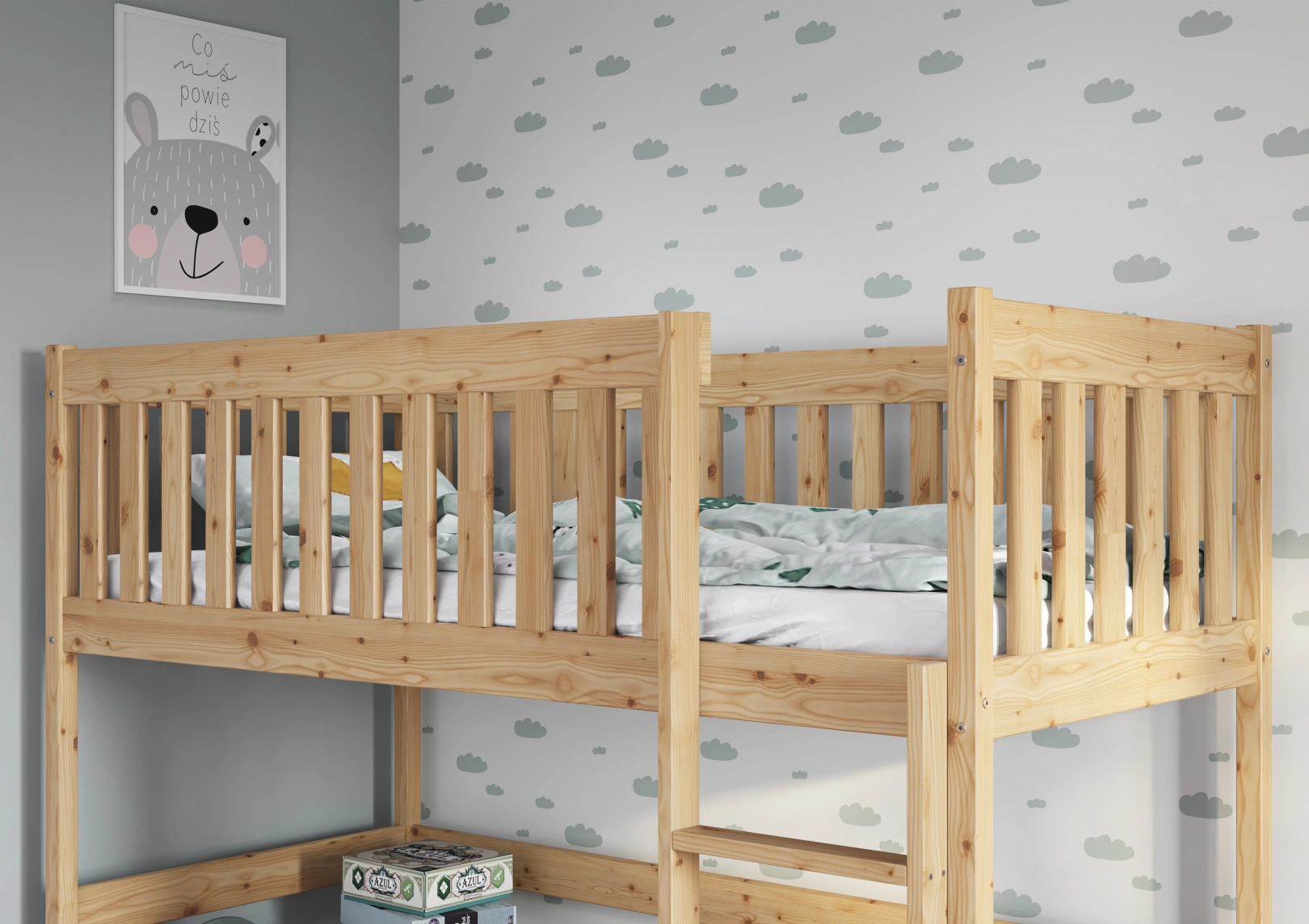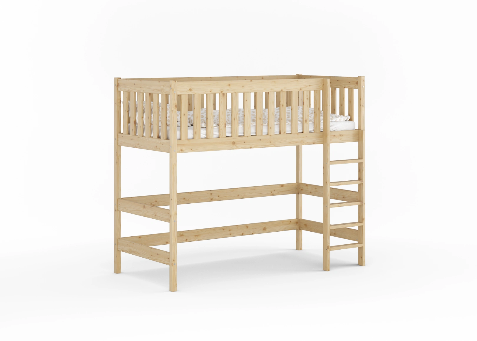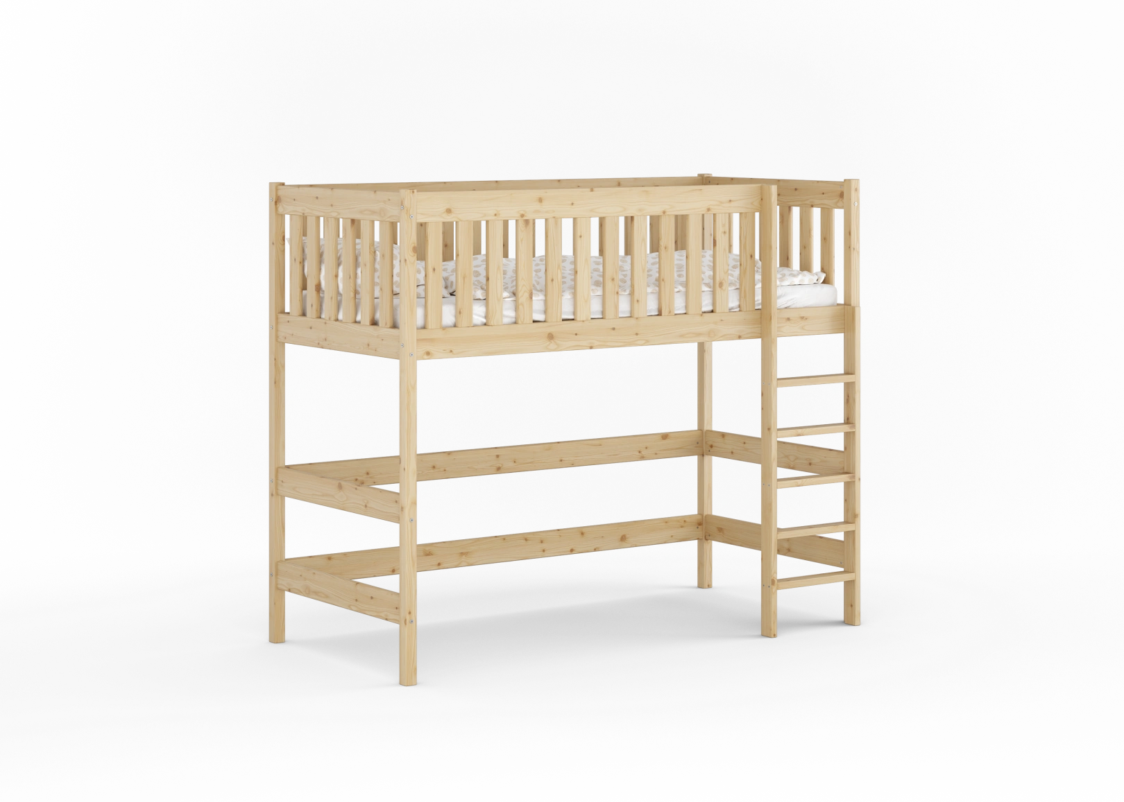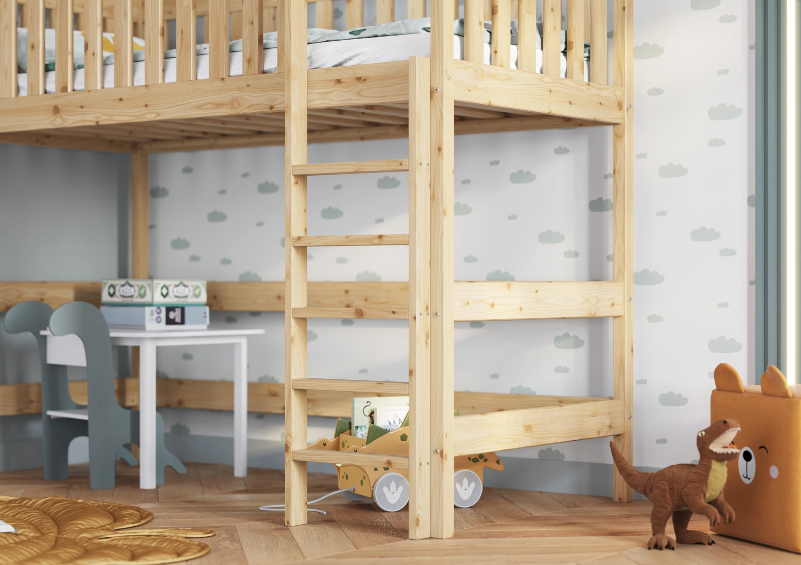 Solidna drabinka do łóżka z drewna sosnowego z szerokimi stopniami i poręczami zapewnia bezpieczny dostęp do górnej części. Idealna dla trzylatków, gwarantuje stabilność łóżka. Estetyczny dodatek, który jednocześnie ułatwia życie i ozdabia pokój