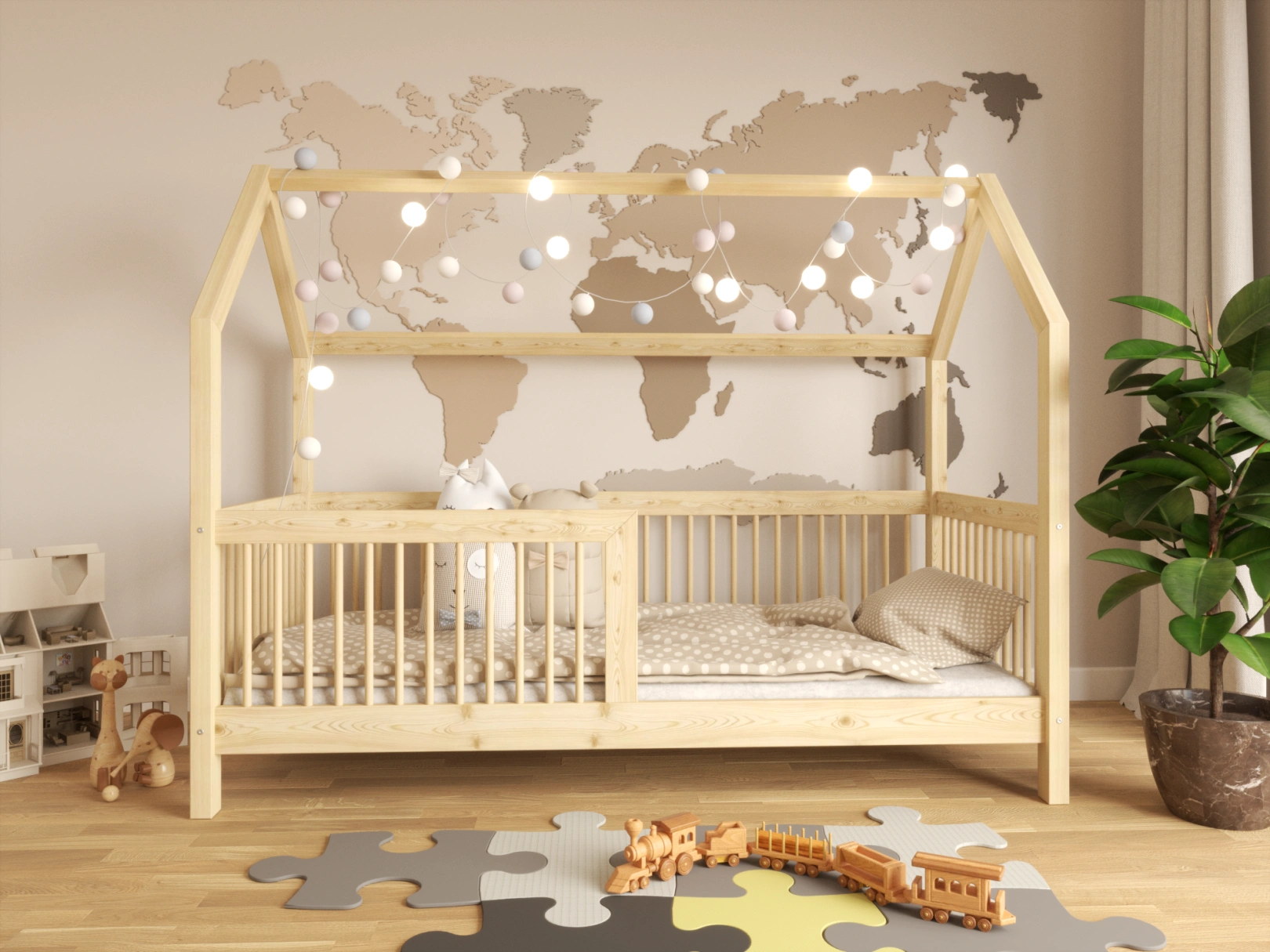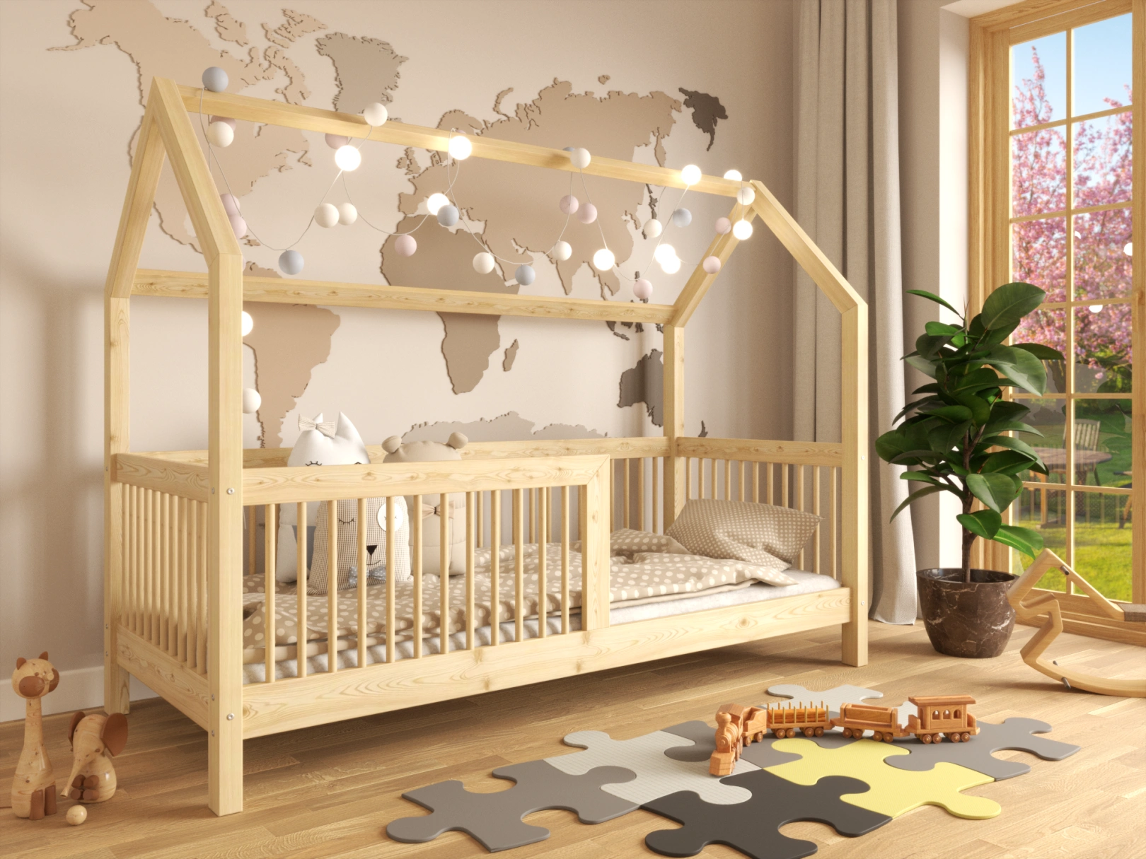 - Łóżko wykonane z litego drewna sosnowego i zabezpieczone farbą antyalergiczną