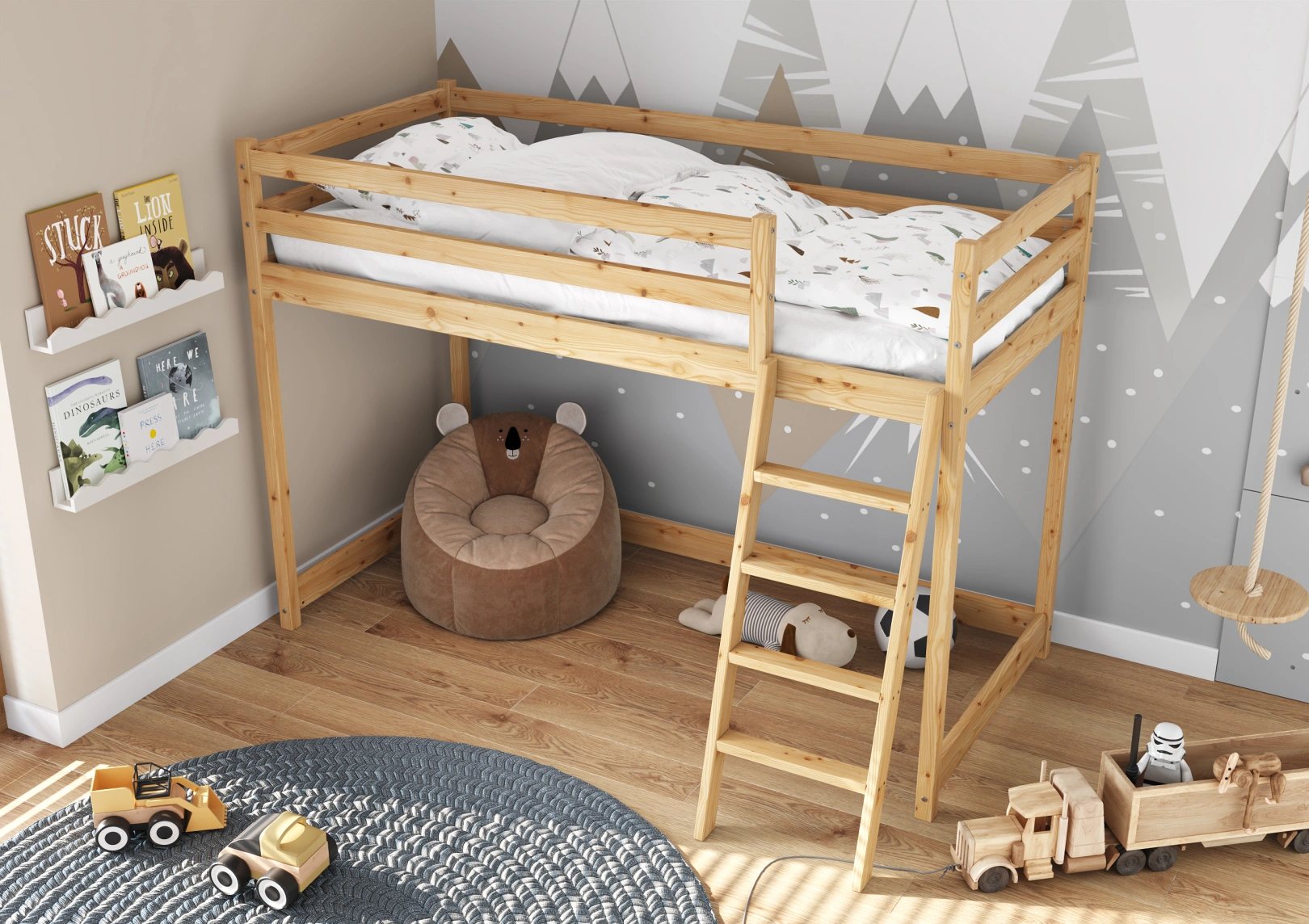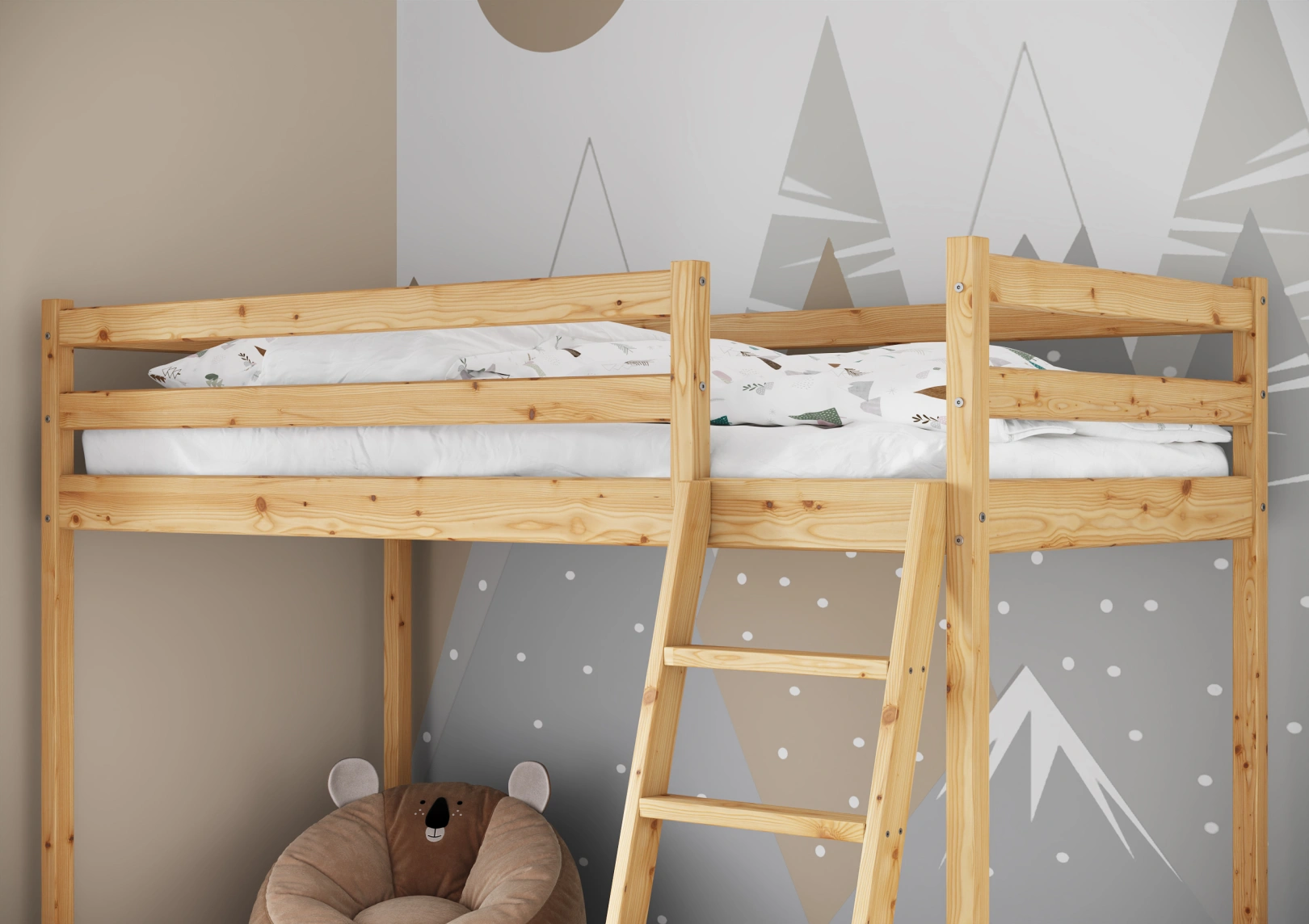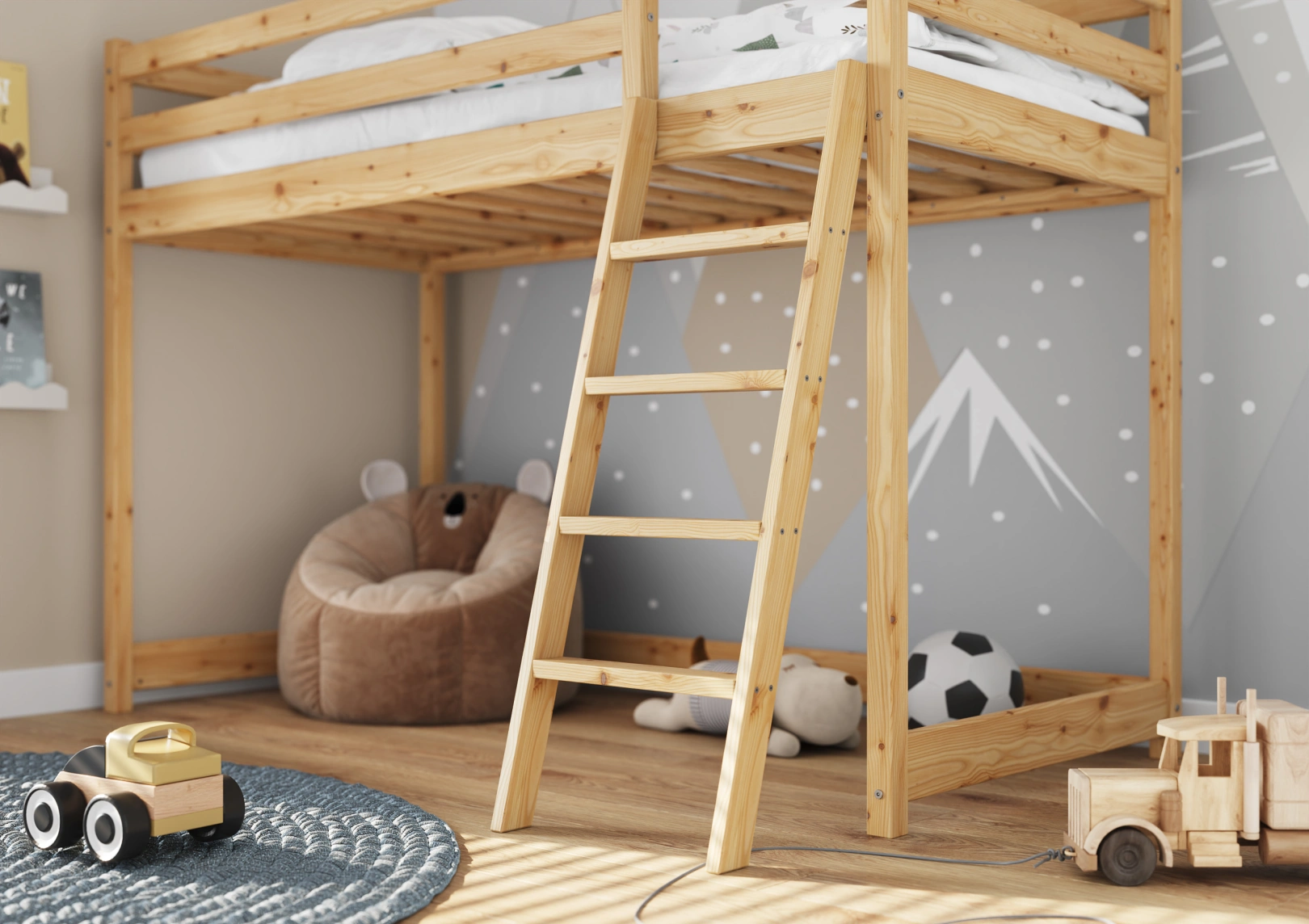 Solidna drabinka do łóżka z drewna sosnowego z szerokimi stopniami i poręczami zapewnia bezpieczny dostęp do górnej części. Idealna dla trzylatków, gwarantuje stabilność łóżka. Estetyczny dodatek, który jednocześnie ułatwia życie i ozdabia pokój