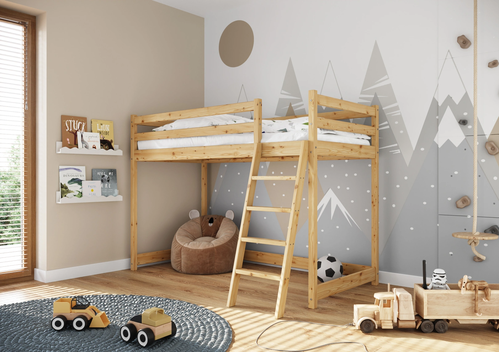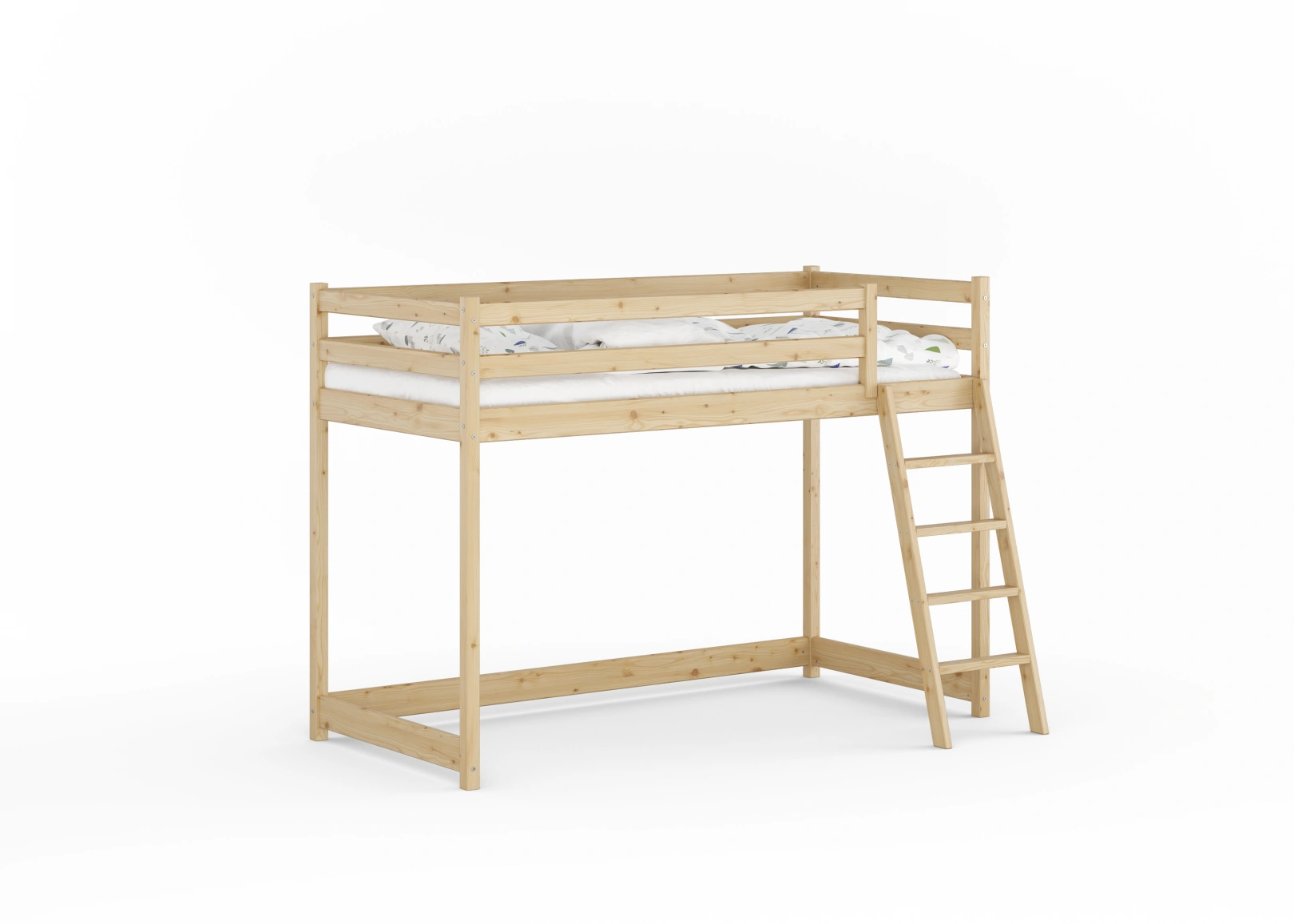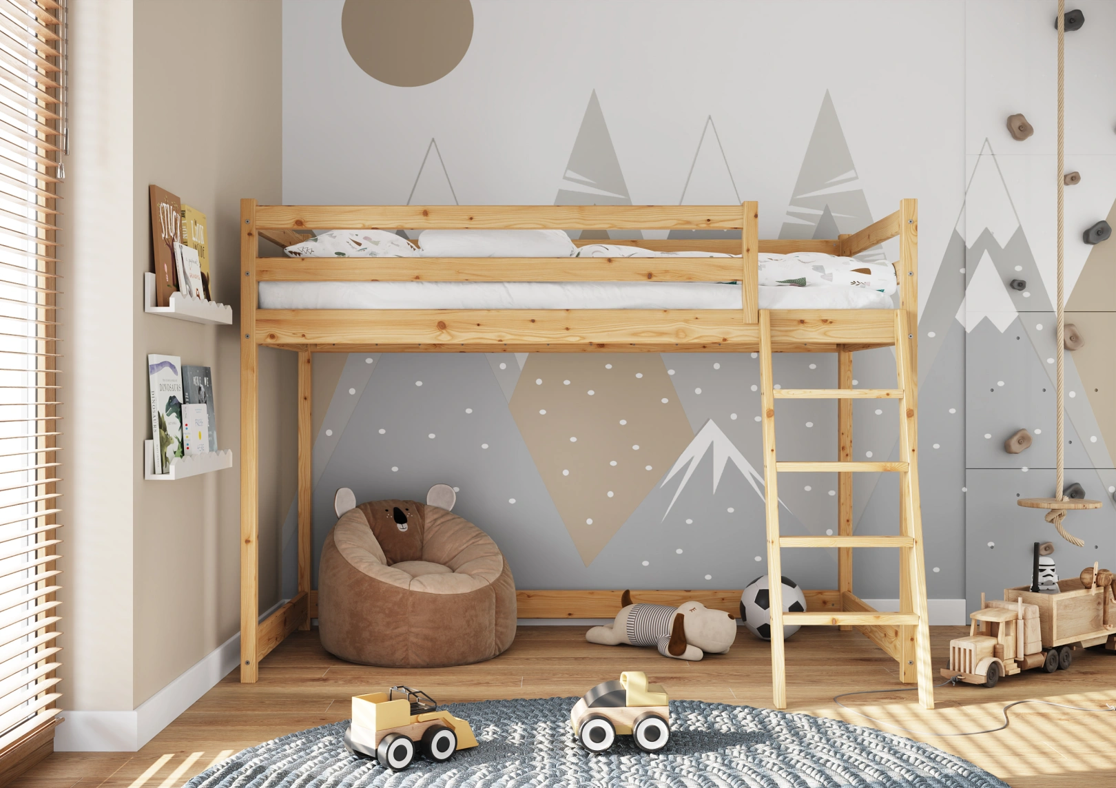 Solidna drabinka do łóżka z drewna sosnowego z szerokimi stopniami i poręczami zapewnia bezpieczny dostęp do górnej części. Idealna dla trzylatków, gwarantuje stabilność łóżka. Estetyczny dodatek, który jednocześnie ułatwia życie i ozdabia pokój