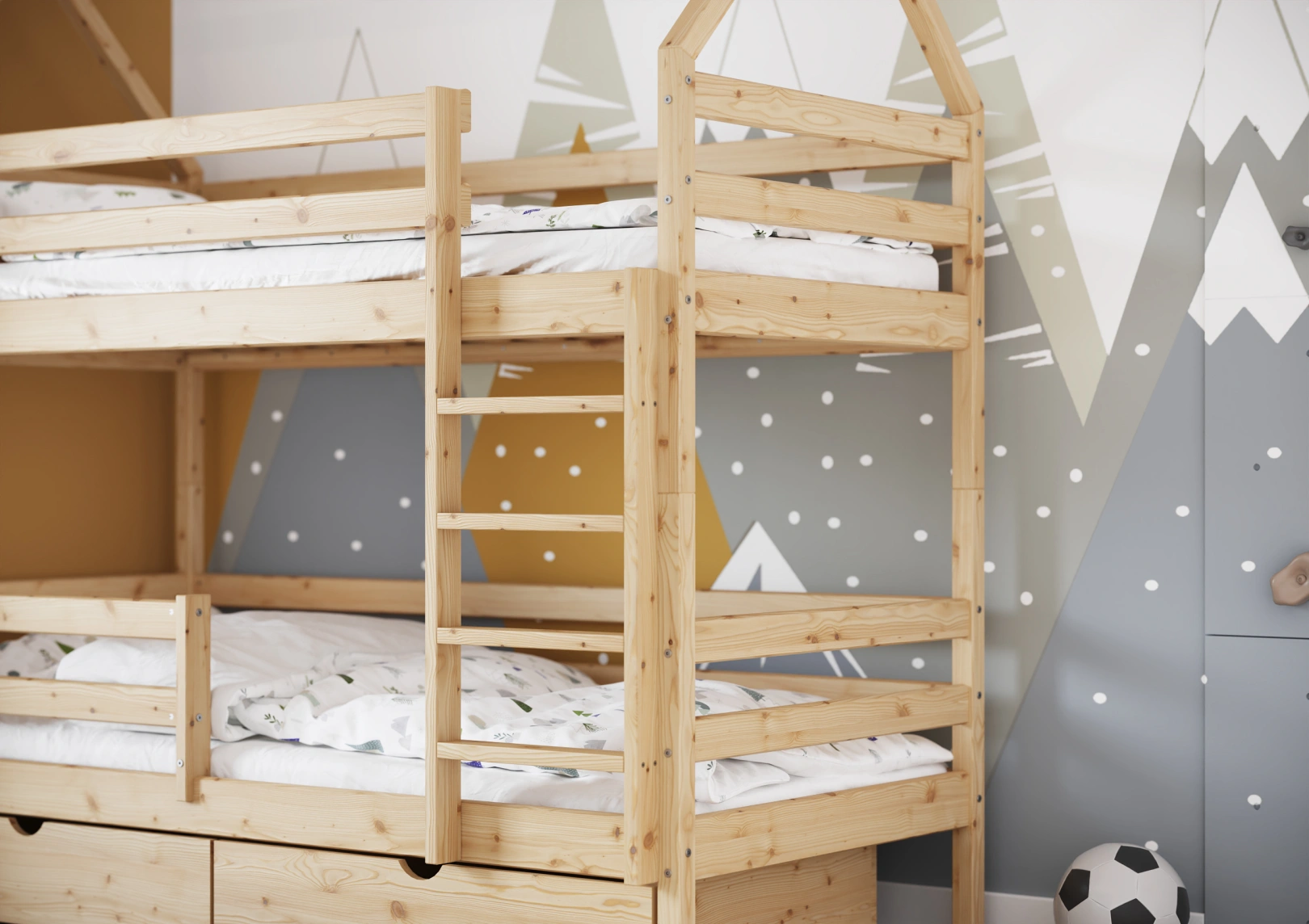 Solidna drabinka do łóżka z drewna sosnowego z szerokimi stopniami i poręczami zapewnia bezpieczny dostęp do górnej części. Idealna dla trzylatków, gwarantuje stabilność łóżka. Estetyczny dodatek, który jednocześnie ułatwia życie i ozdabia pokój