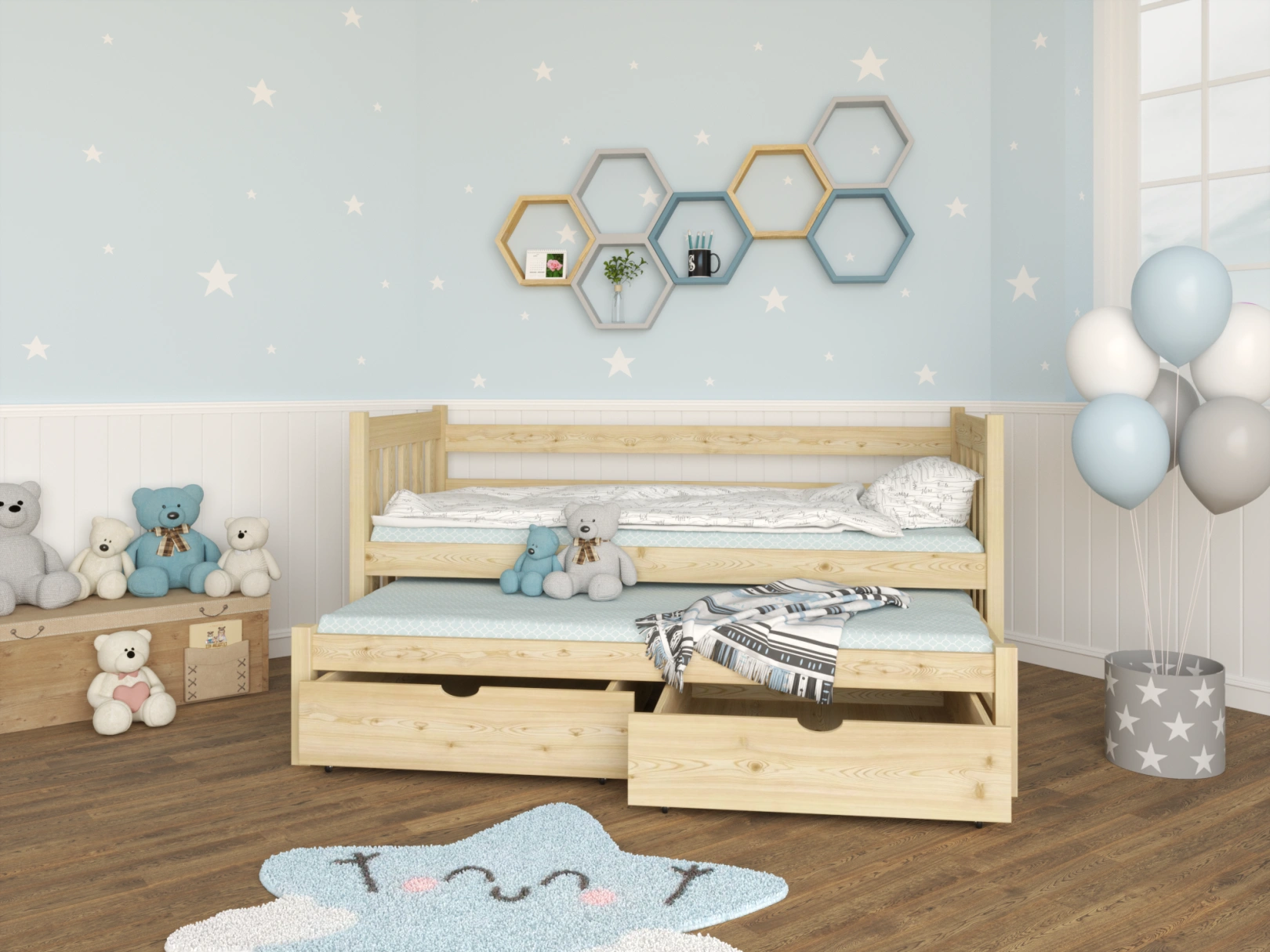 Model Milena to nowoczesne łóżko dla dziewczynki i jej przyjaciółki,z wbudowanym wysuwanym materacem, zapewniającym dodatkową przestrzeń do spania.Posiada ochronne zagłówki, dodające bezpieczeństwa i estetyki, oraz pojemneszuflady na akcesoria i zabawki. Wyprodukowane z litego drewna sosnowego.