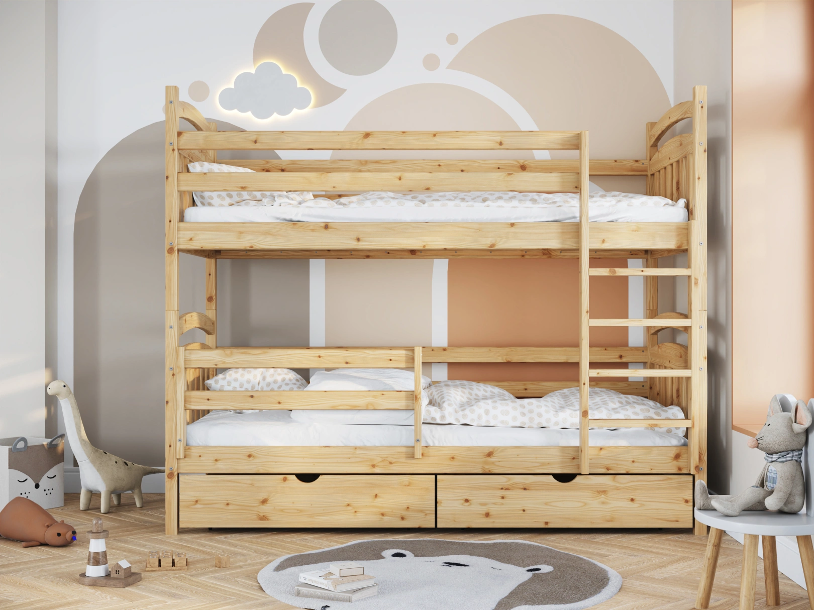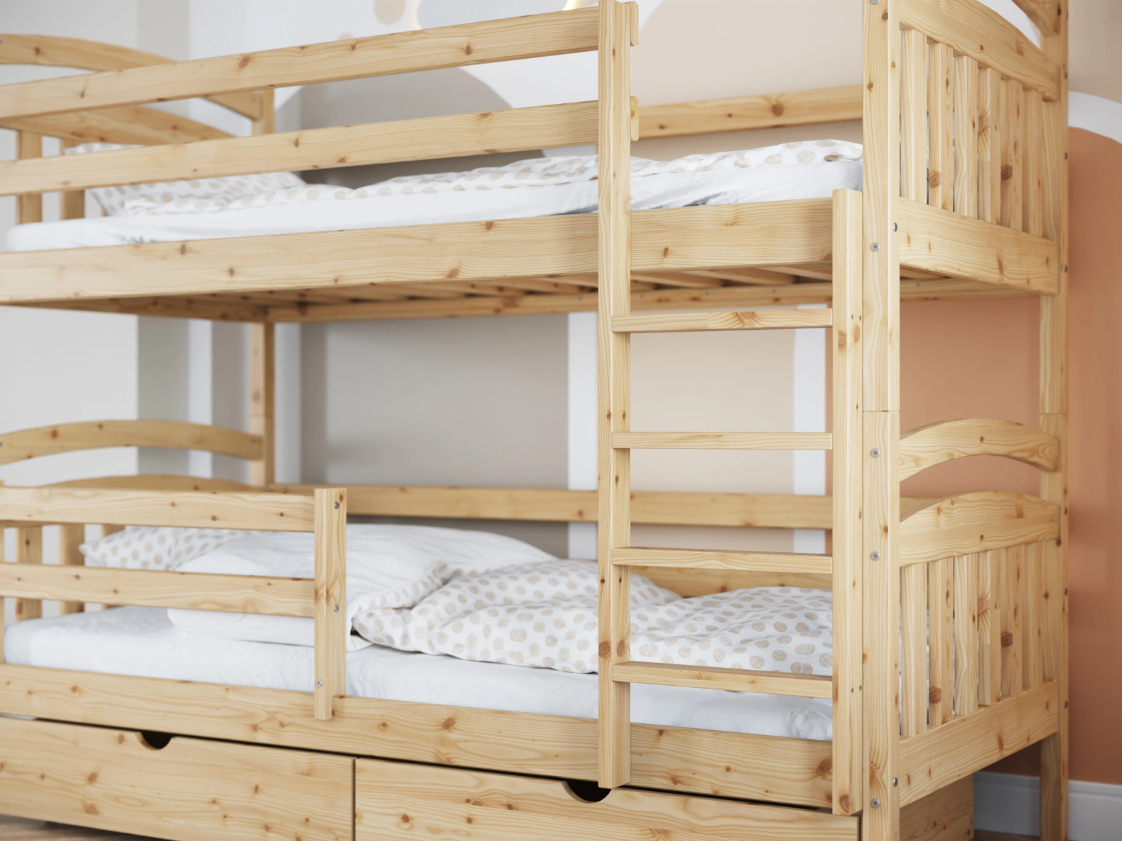 Solidna drabinka do łóżka z drewna sosnowego z szerokimi stopniami i poręczami zapewnia bezpieczny dostęp do górnej części. Idealna dla trzylatków, gwarantuje stabilność łóżka. Estetyczny dodatek, który jednocześnie ułatwia życie i ozdabia pokój