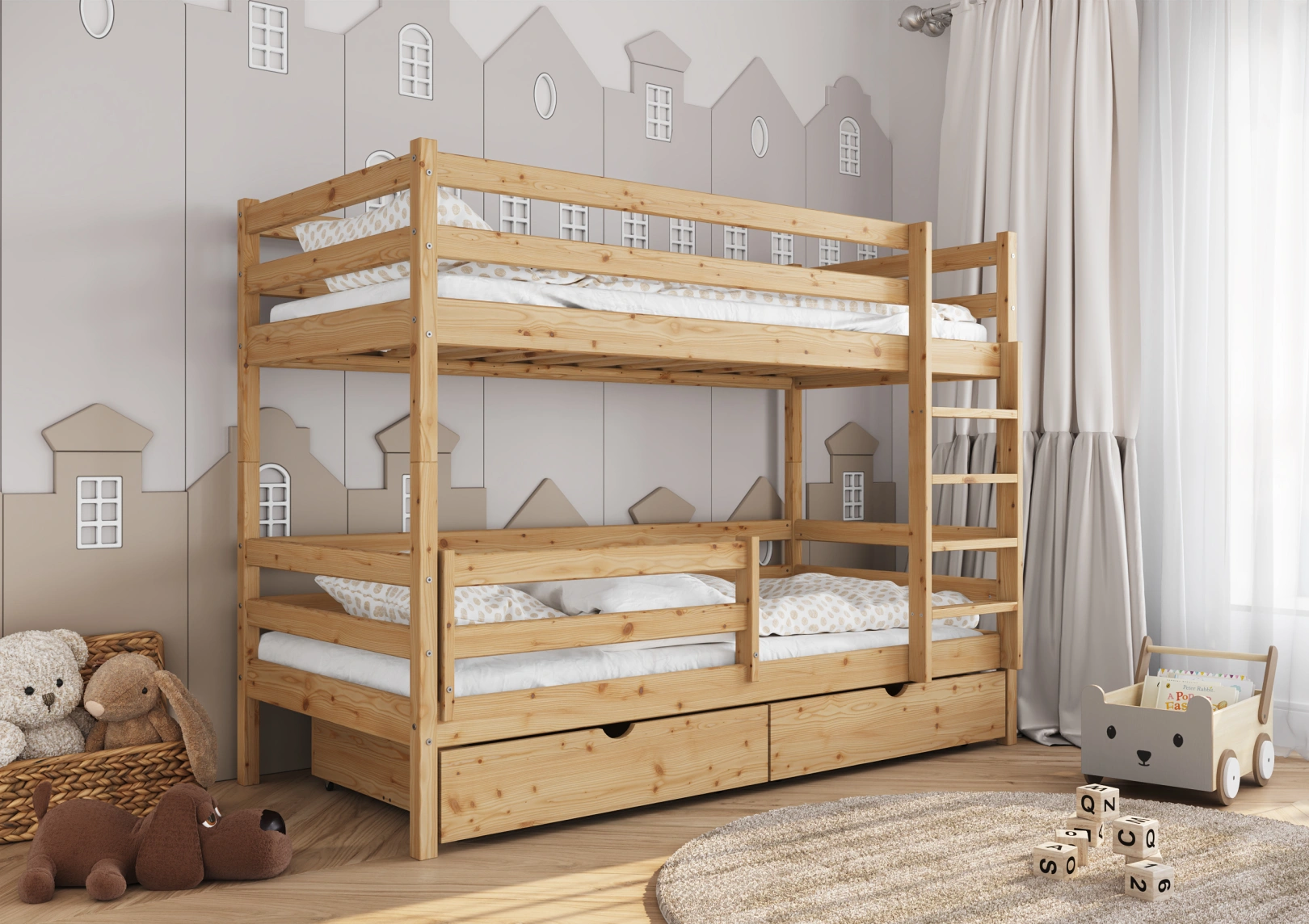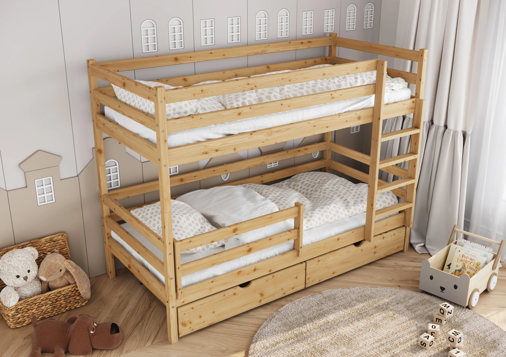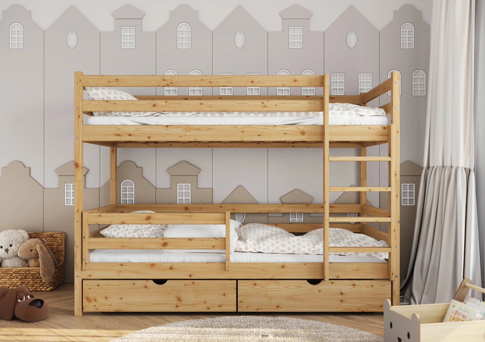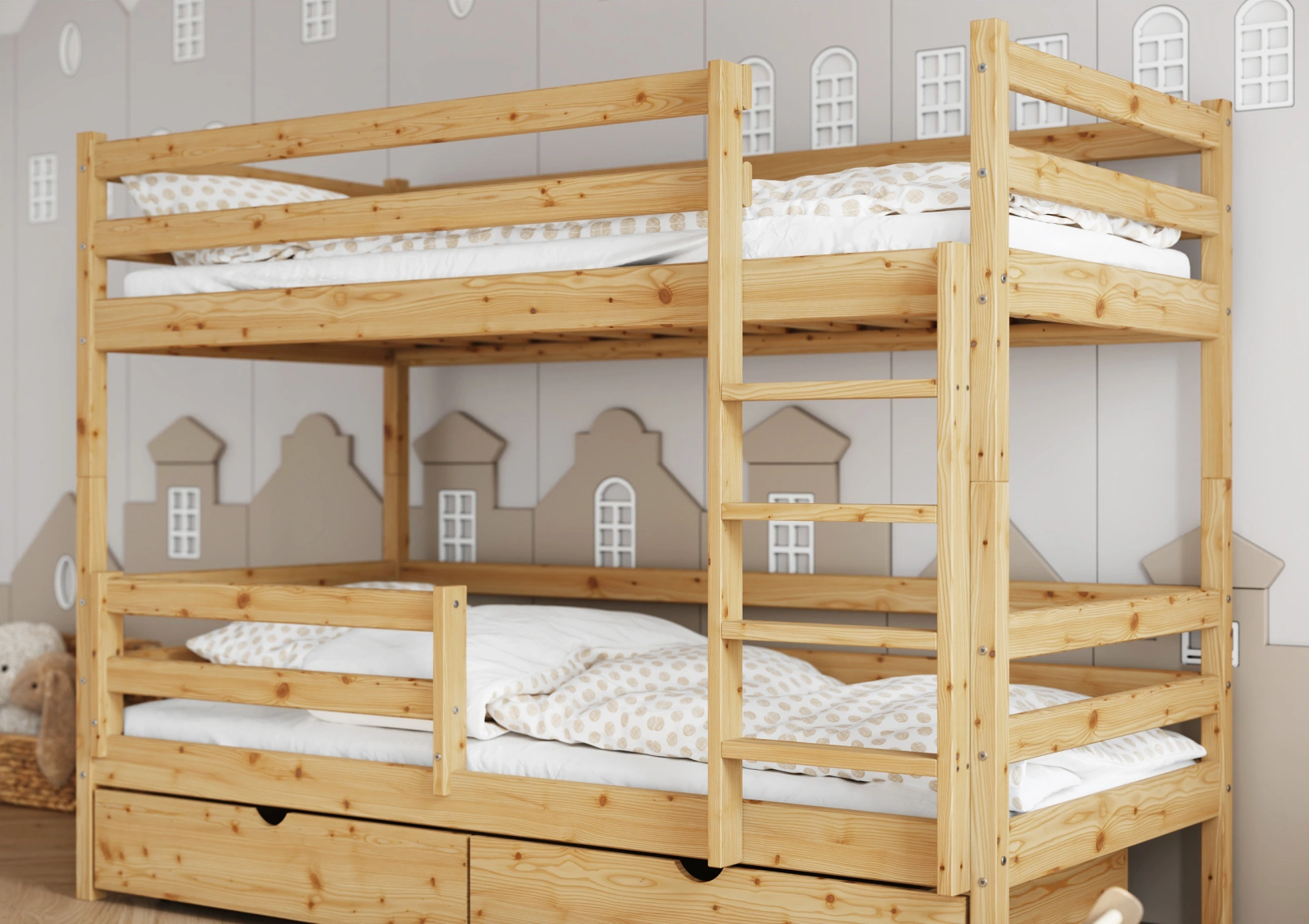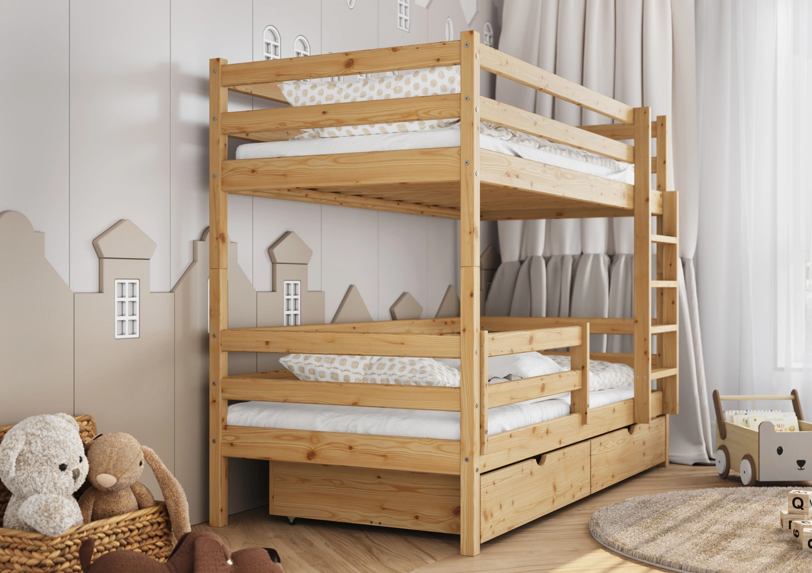 Solidna drabinka do łóżka z drewna sosnowego z szerokimi stopniami i poręczami zapewnia bezpieczny dostęp do górnej części. Idealna dla trzylatków, gwarantuje stabilność łóżka. Estetyczny dodatek, który jednocześnie ułatwia życie i ozdabia pokój