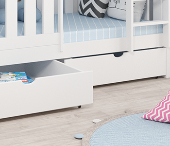 Szuflady pod łóżkiem (80 cm głębokości) na kółkach to praktyczne rozwiązanie na pościel. Odporne na zabrudzenia dzięki solidnej płycie laminowanej z białą okleiną. Umożliwiają sprytną organizację pokoju dziecka, z dodatkowym miejscem na pościel, zabawki lub ubrania
