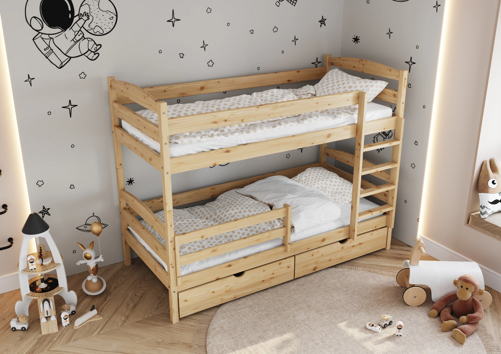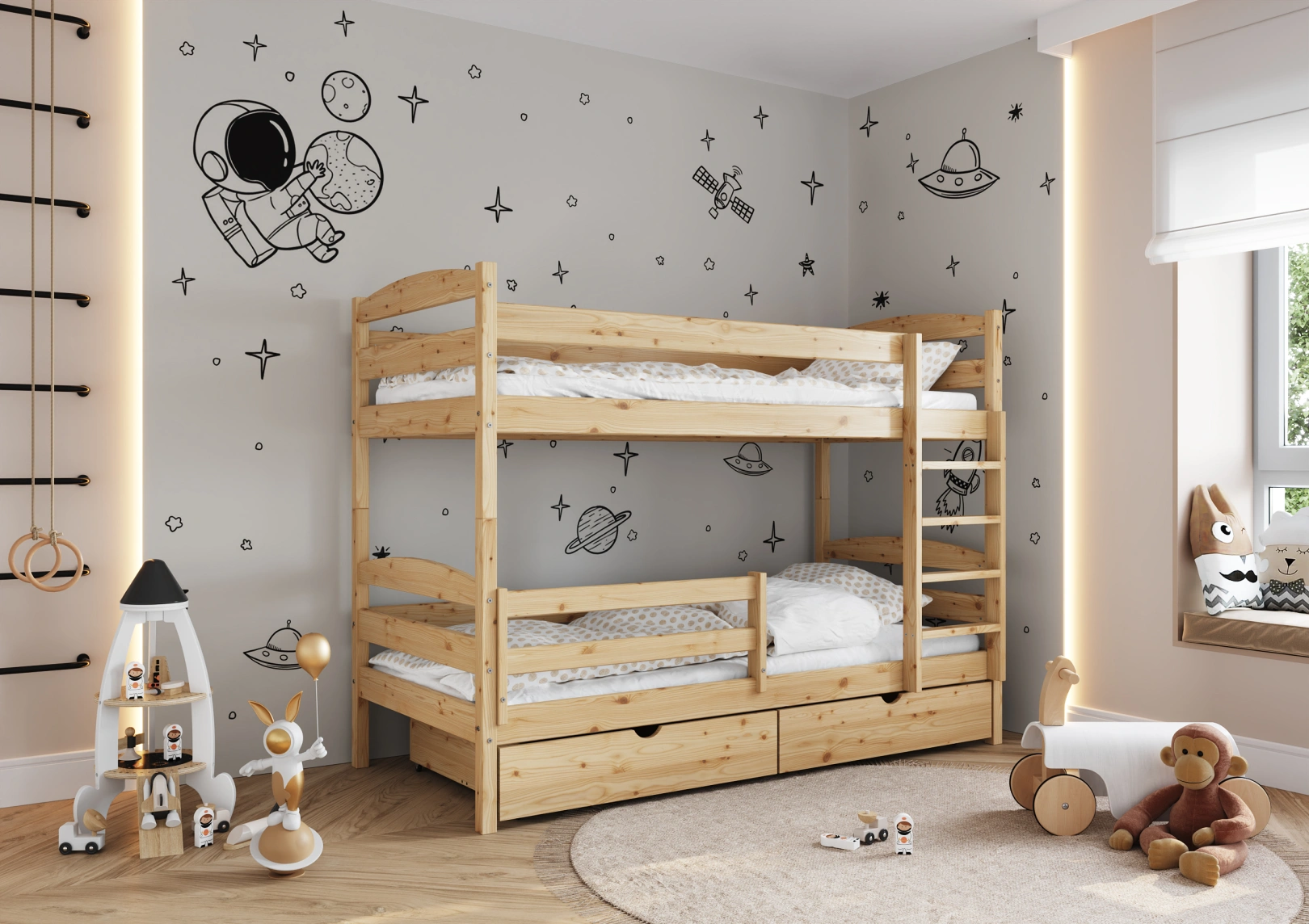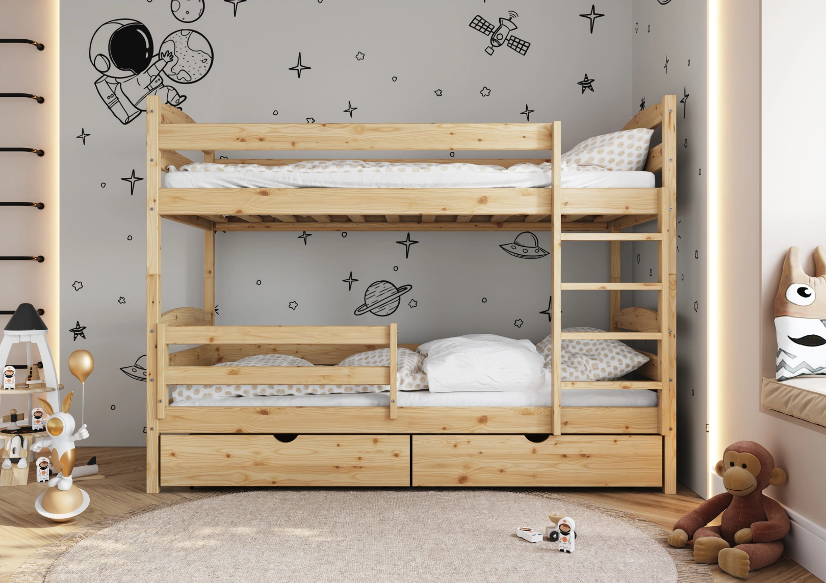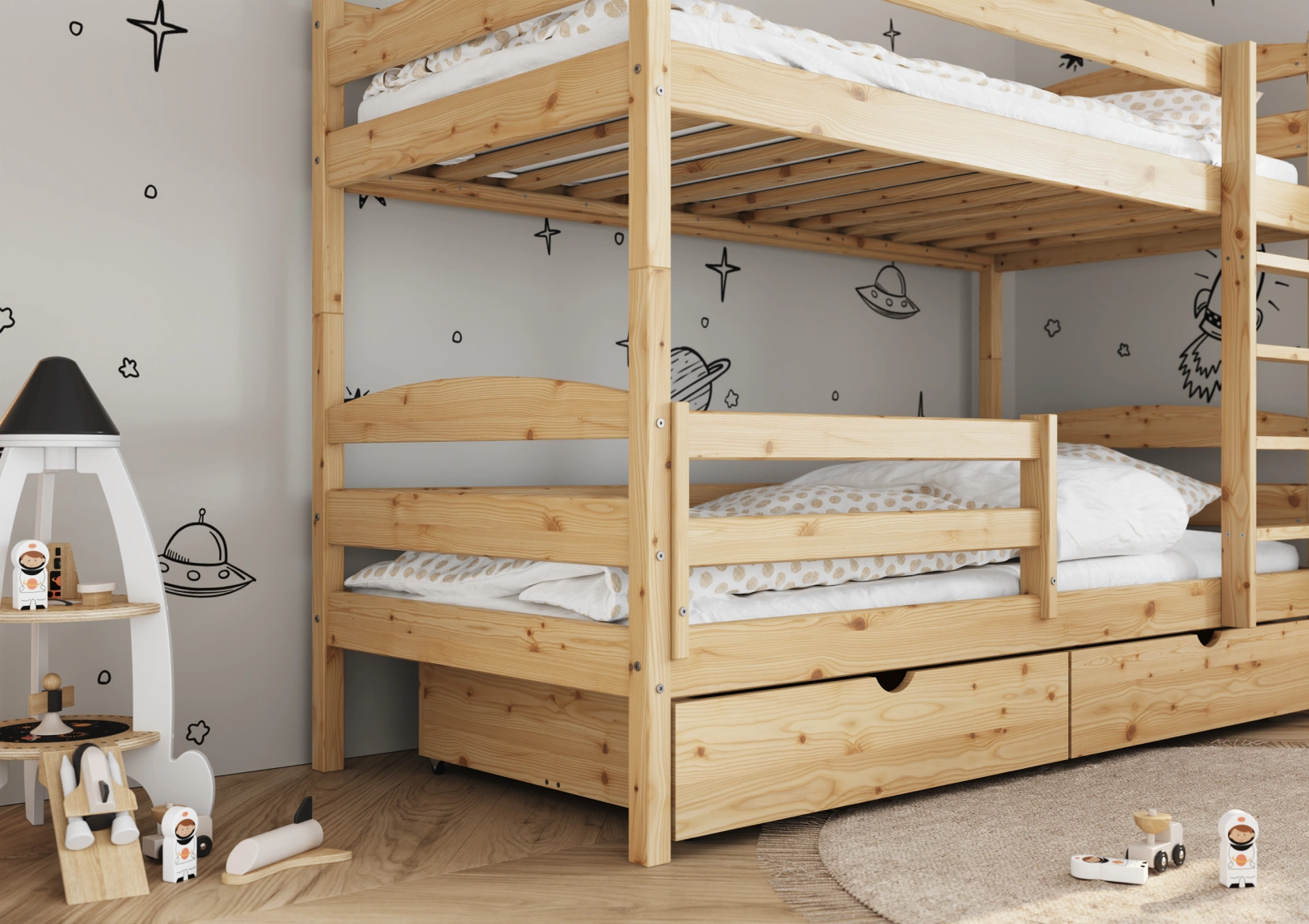 Oskar to solidne łóżko piętrowe, wykonane z litego drewna sosnowego i pokryte antyalergiczną farbą, bezpieczną dla dzieci. Dostępne w bogatej palecie kolorów, pasujących do różnych przestrzeni dla dzieci w różnym wieku.