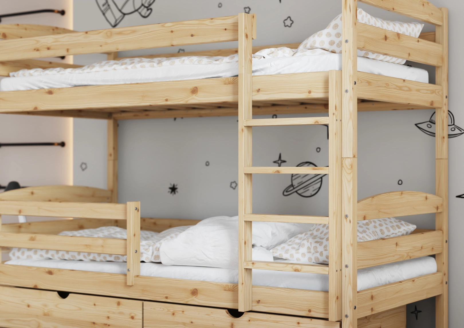 Solidna drabinka do łóżka z drewna sosnowego z szerokimi stopniami i poręczami zapewnia bezpieczny dostęp do górnej części. Idealna dla trzylatków, gwarantuje stabilność łóżka. Estetyczny dodatek, który jednocześnie ułatwia życie i ozdabia pokój