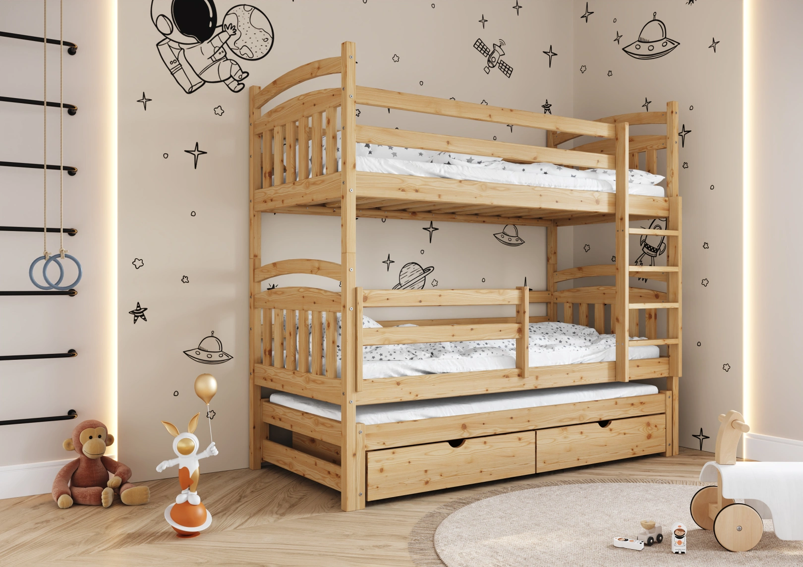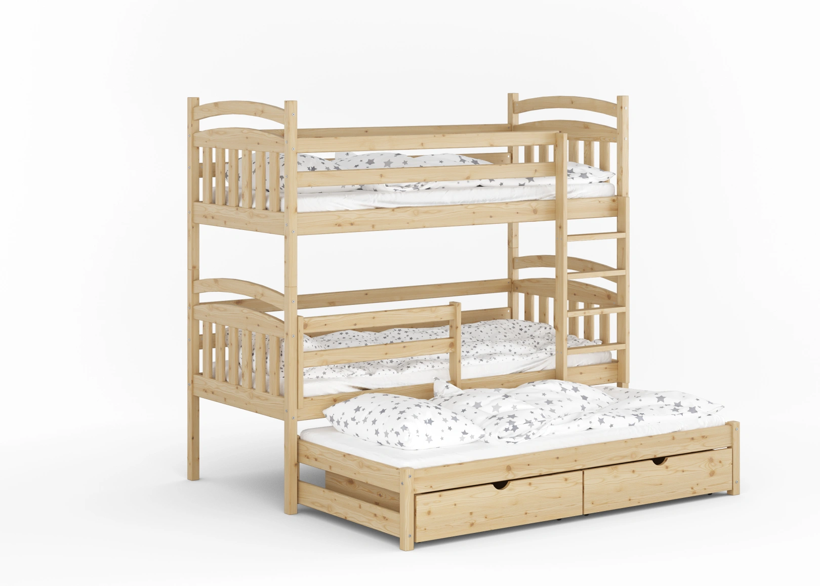 Łóżko piętrowe Robert to idealne połączenie komfortu i bezpieczeństwa dla dzieci. Wytrzymały stelaż i rama wykonane z litego drewna sosnowego, pokryte ekologiczną farbą. Specjalne barierki zabezpieczające z poziomymi deskami chronią maluchy przed upadkiem. Stabilna drabinka, wysuwana dolna część z trzecim miejscem do spania oraz dwie dodatkowe szuflady na drobiazgi dla dzieci.
