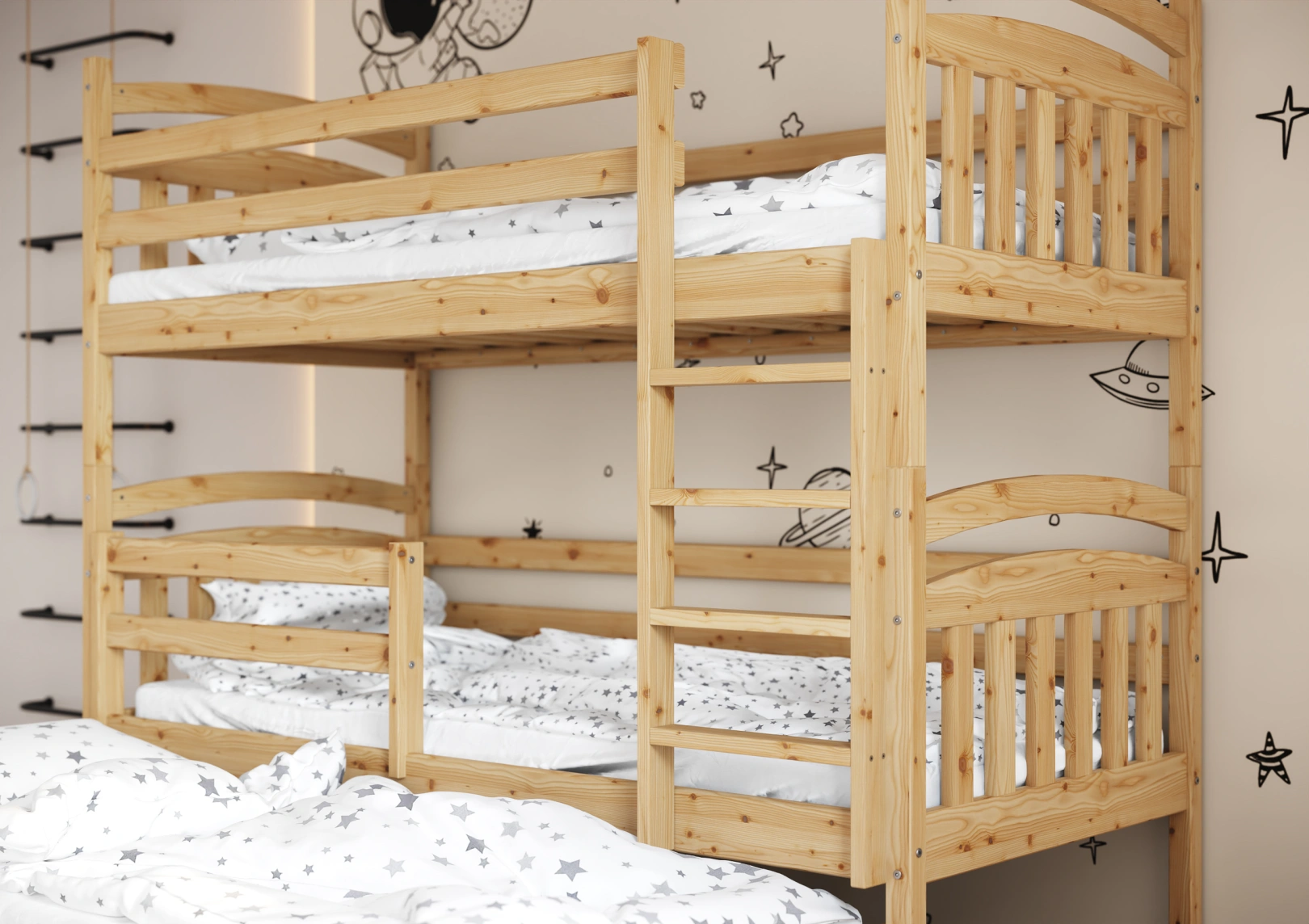 Solidna drabinka do łóżka z drewna sosnowego z szerokimi stopniami i poręczami zapewnia bezpieczny dostęp do górnej części. Idealna dla trzylatków, gwarantuje stabilność łóżka. Estetyczny dodatek, który jednocześnie ułatwia życie i ozdabia pokój