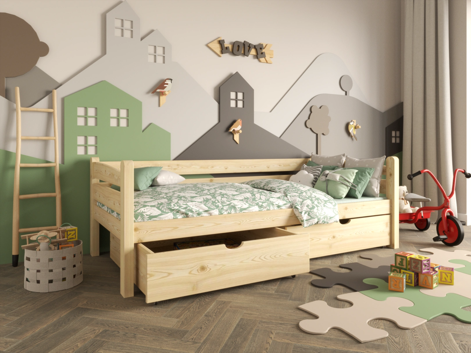 Wszystkie krawędzie są zaokrąglone, a łóżko zaprojektowane z myślą o maksymalnym bezpieczeństwie Twojego dziecka. Wszystkie elementy są dokładnie wykończone, a drewno jest gładkie i przyjemne w dotyku.